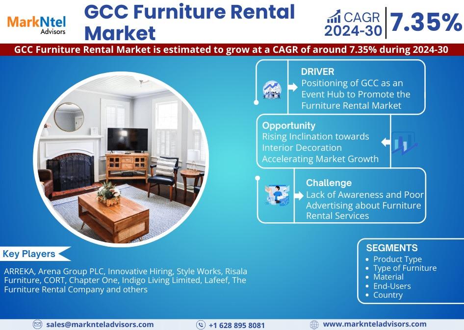 MarkNtel Advisors, a leading market research and consulting firm, has announced the release of its latest study titled GCC Furniture Rental Market Research Report: Forecast (2024–2030). This report provides a detailed assessment of the GCC Furniture Rental, covering its evolving dynamics, emerging trends, key growth drivers, major challenges, and competitive landscape.